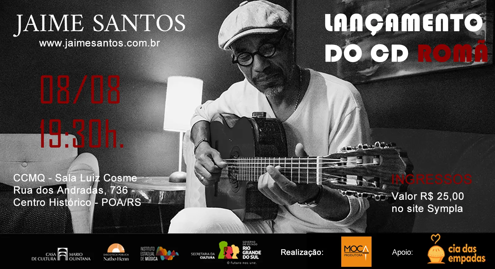 Show de lançamento do CD Romã, de Jaime Santos, com voz e violão, no dia 08 de agosto, às 19h30. Jaime se apresentará na Sala Luiz Cosme, no Centro de Cultura Mário Quintana, na rua dos Andradas, 736, Centro Histórico de Porto Alegre. O show contará com 12 canções de autoria de Jaime Santos e parceiros. Ingressos antecipados na plataforma Sympla (www.sympla.com.br) a R$ 25,00.