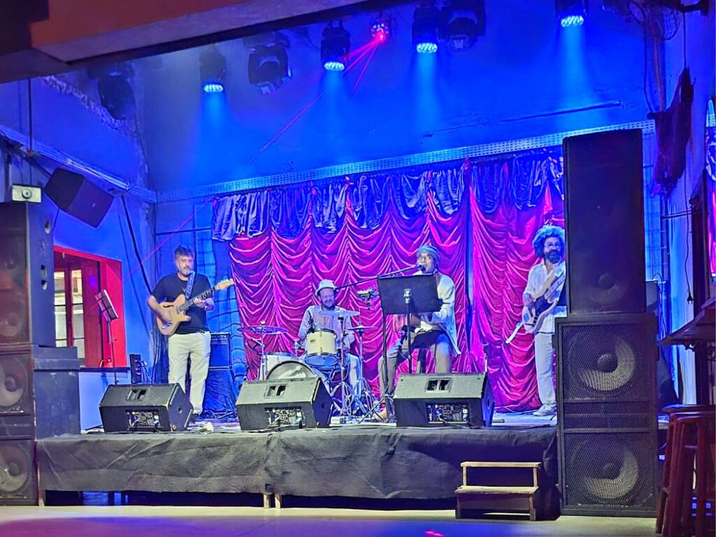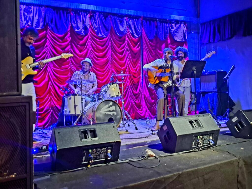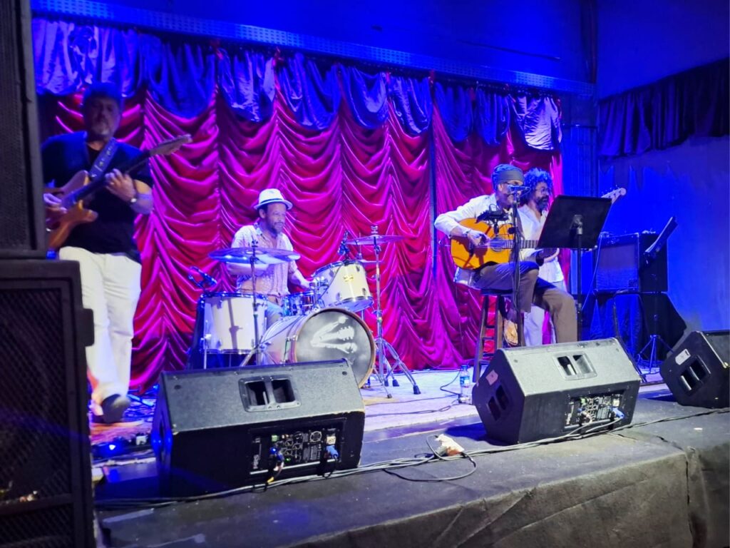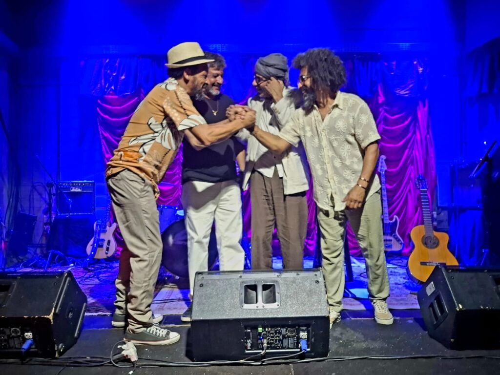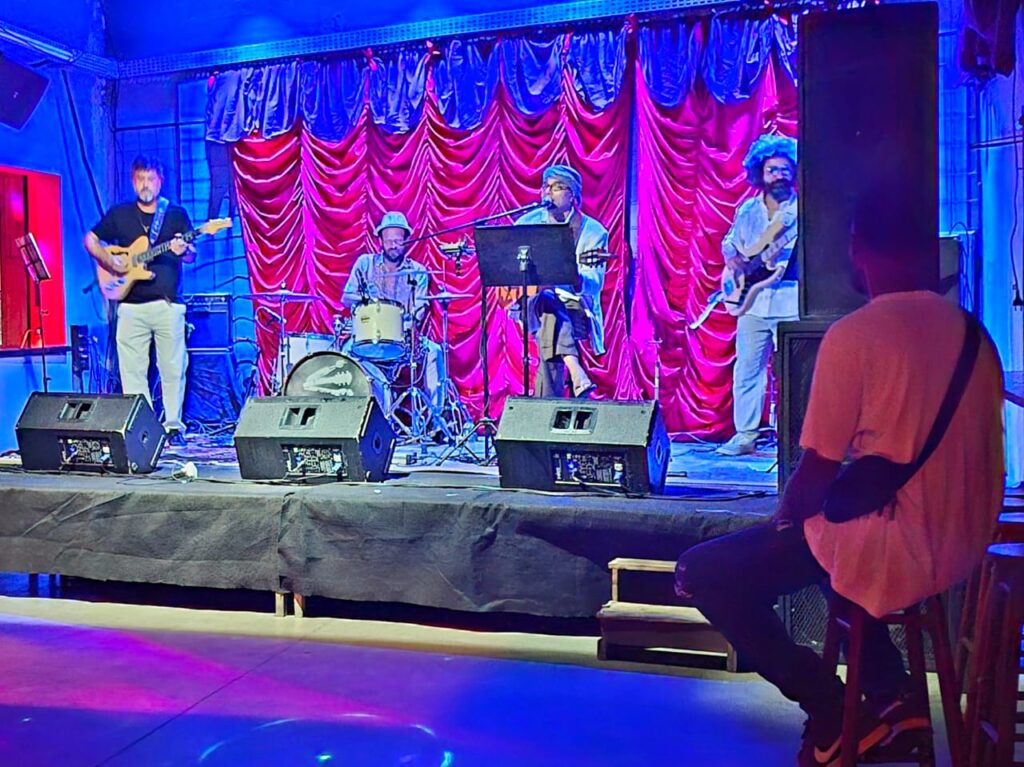 A frente do trio, Jaime Santos assina a voz e o violão. Com timbre marcante e interpretação sensível, ele conduz o repertório com intensidade e lirismo. Seu violão é ao mesmo tempo chão e voo – ancorando as harmonias com riqueza rítmica e trazendo a tona influências que vão de João Bosco a Lenine,
